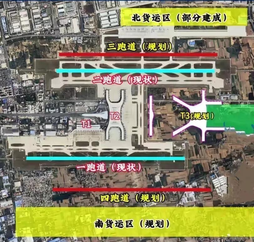 从假想容量来看,这是一个接近翻倍的升迁。 现存的T1、T2航站楼假想容量为4000万东说念主次,而三期扩建完成后,扫数机场的年游客保险才智将指向8000万东说念主次。 货运方面,将从现存的110万吨假想才智,升迁至400万吨。